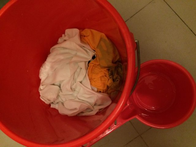 1週間ほど洗濯物をためて近くのランドリーに持っていくか、上の写真のようにバケツにお湯を入れて、洗剤を入れて手でゴシゴシあらうかです。