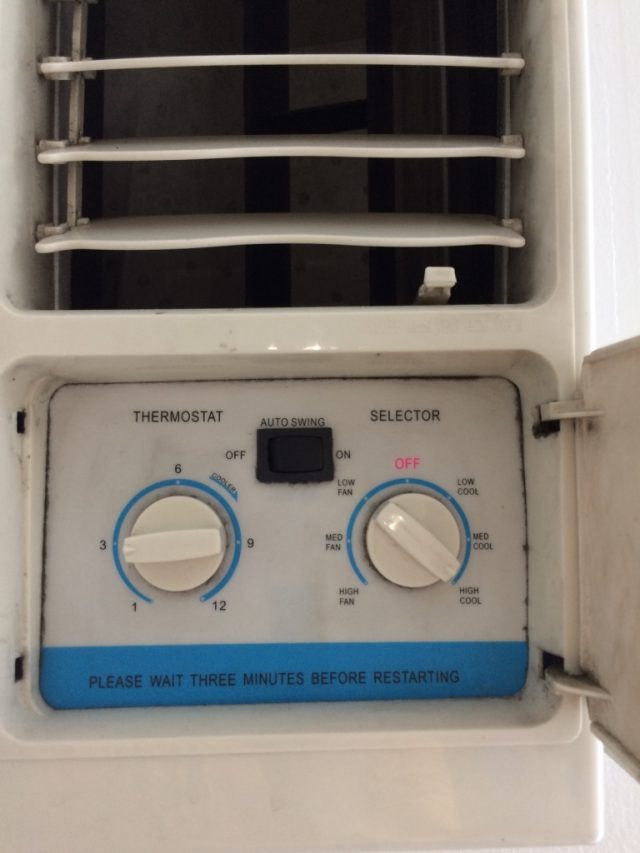 エアコンは立方体の安いやつが多く、温度調整は弱と強の2段階が多いです。
