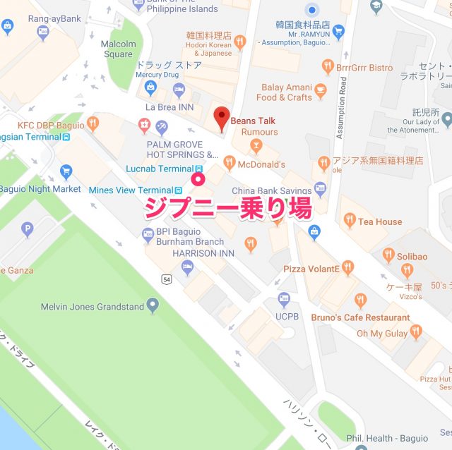 ライトパーク(Wright Park) 行き方に書いたように、バーナムパークとカフェBeans Talkの間の場所から出ているジプニーで行けます。
