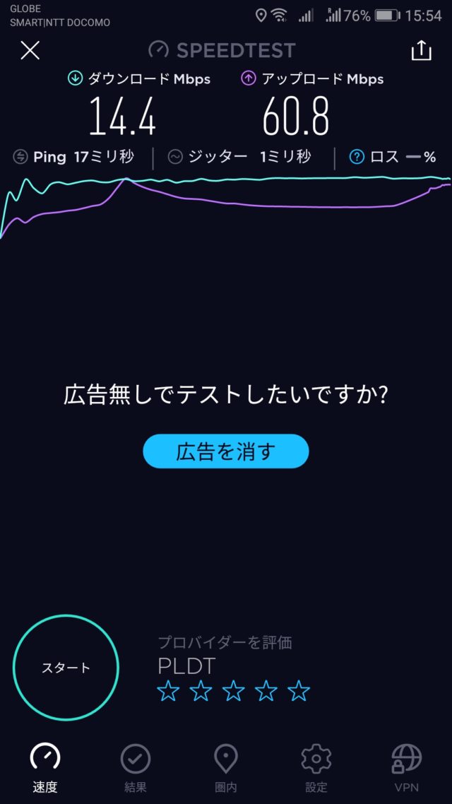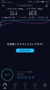 ダウンロードで14Mbps以上出ているので、動画を観るのにも十分な速度です。アップロードはなんと、70Mbps超え!セブ島で最速水準ですね。動画のアップロードにも十分な速度ですね。
