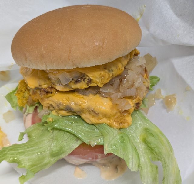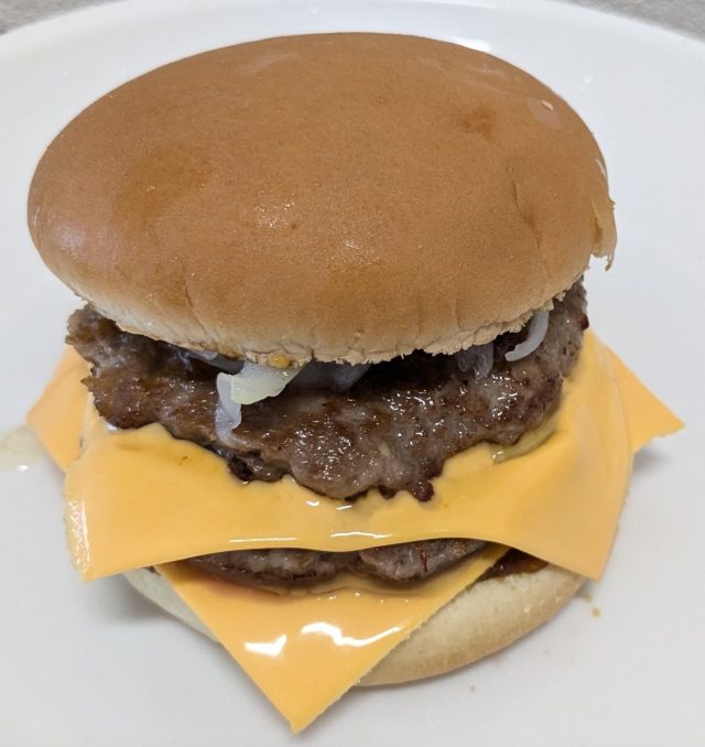 下から順に、バンズ(下)、ソース、パテ、チーズ、パテ、チーズ、玉ねぎ、ソース、バンズ(上)