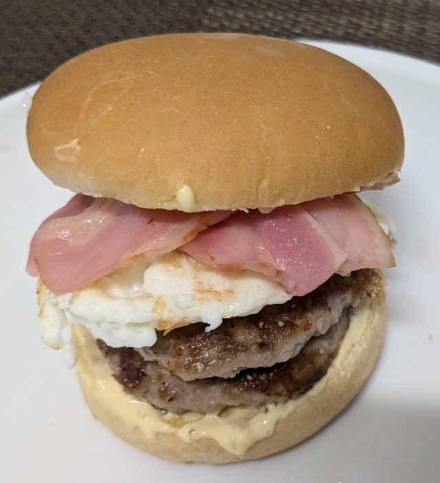 下から順に、バンズ(下)、ソース、パテ、ベーコン、レタス、トマト、玉ねぎ、ソース、バンズ(上)