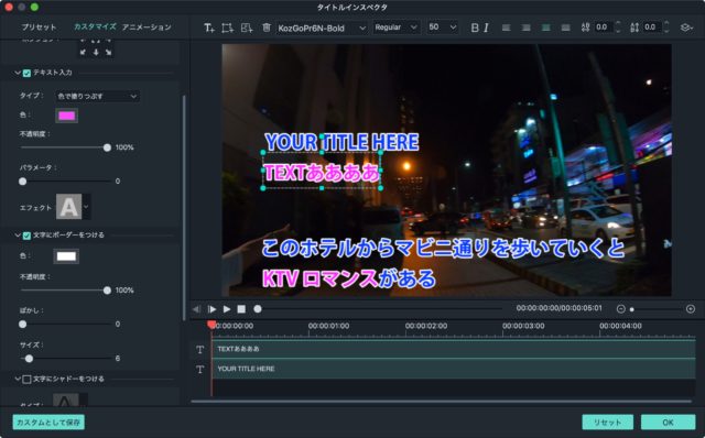 テロップを「二行にしたい」、「アニメーションさせたい」といったカスタマイズもこの「タイトルインスペクタ」画面で行います。