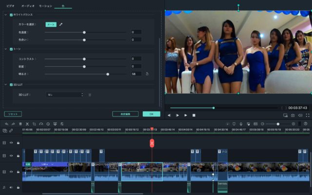 その他コントラスト、彩度、ホワイトバランス等もFilmora上で調整出来ます。