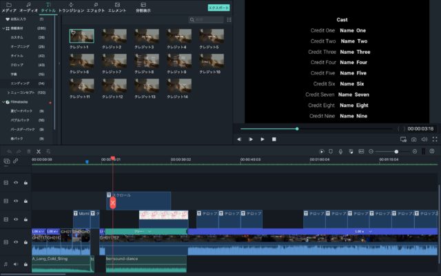 「タイトル」-「搭載素材」-「エンディング」の中にある「クレジット1」を選び、タイムラインに入れ、ダブルクリックで開いて編集します。
