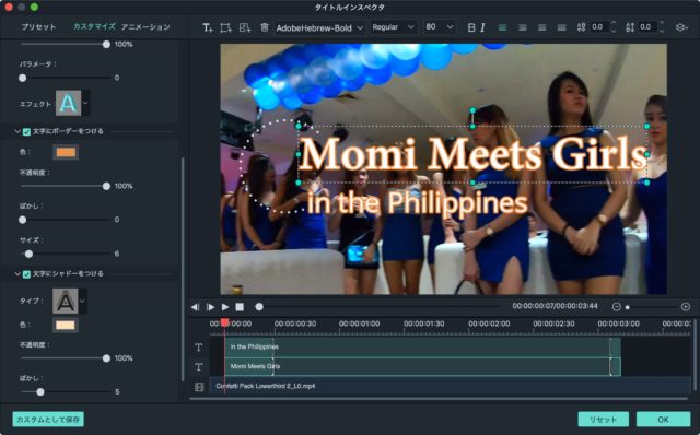 オープニングの最後のタイトル、「Momi Meets Girls」のテキストアニメーションですが、これはfilmstocksのバブルパックを使っています。
