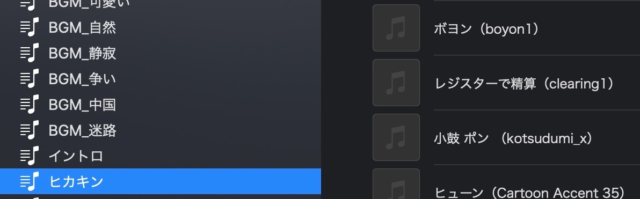 例えば、KTVの動画を編集する場合、このプレイリストの中の「BGM_KTV」からBGMをコピー、編集するフォルダーにサウンドファイルをペーストして編集作業しています。