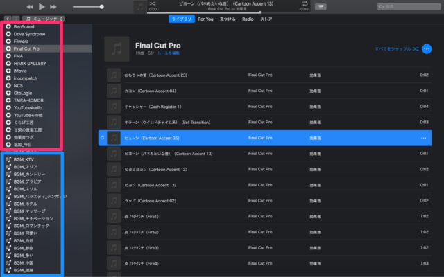 さらに、最近はYouTuberの動画編集をマネてみたりしてるのですが、その際もそのYouTuberが使うBGM、効果音をプレイリストで整理しています。