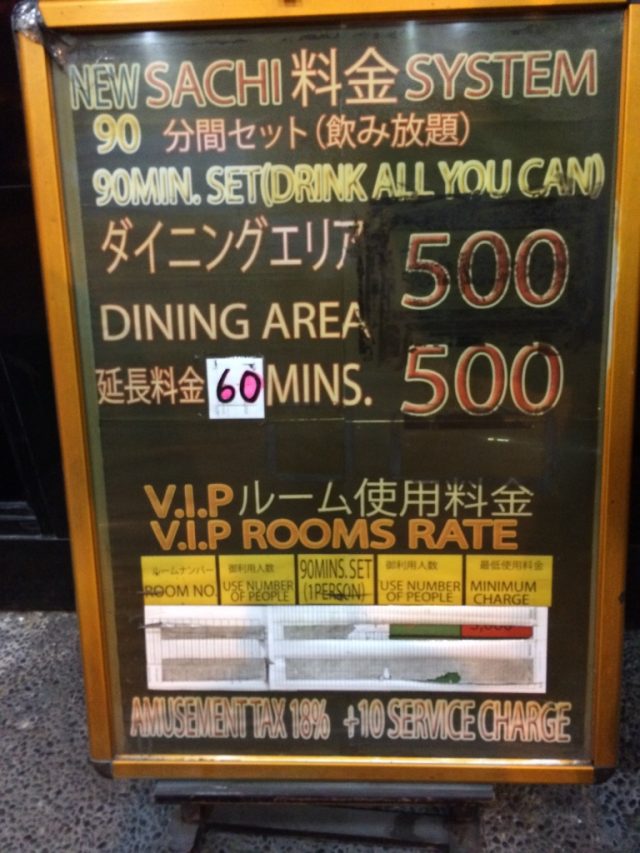 なお、VIPルームの値段ですが、看板に書かれていると思っていたもののなかったため不明です。
