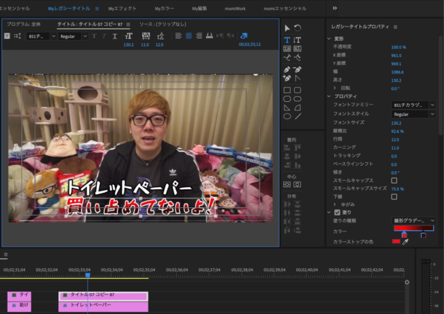 ですので、テロップ全体はエッセンシャルグラフィックスで十分です。レガシータイトル を使う必要は全くないです。
